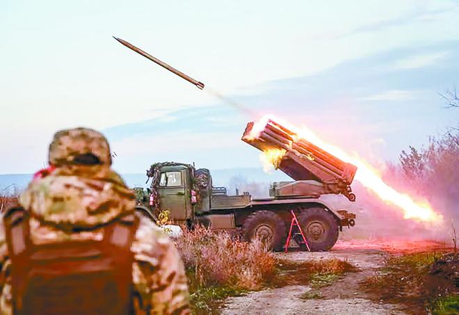 23日,乌军士兵在顿涅茨克州重要堡垒城市康斯坦丁诺夫卡用BM-21“冰雹”多管火箭炮向俄军开火 图源:英媒