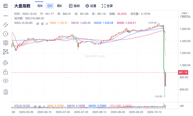 根据饰品市场指数监测网站steamdt,两天内,大盘从1663点暴跌至652点,跌幅超过60%。在10月25日,市场略有回升,目前维持在881点,也是腰斩的跌幅。而热门饰品“蝴蝶刀”两天内价格从20719元跌至5280元,跌幅接近75%。