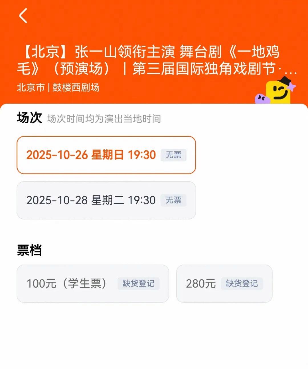 据悉,张一山在《一地鸡毛》中一人分饰15个角色,演出时长约为110分钟。票务平台信息显示,该剧票价分为两档,其中学生票价为100元,其余票价为280元,目前所有票均已显示售罄。