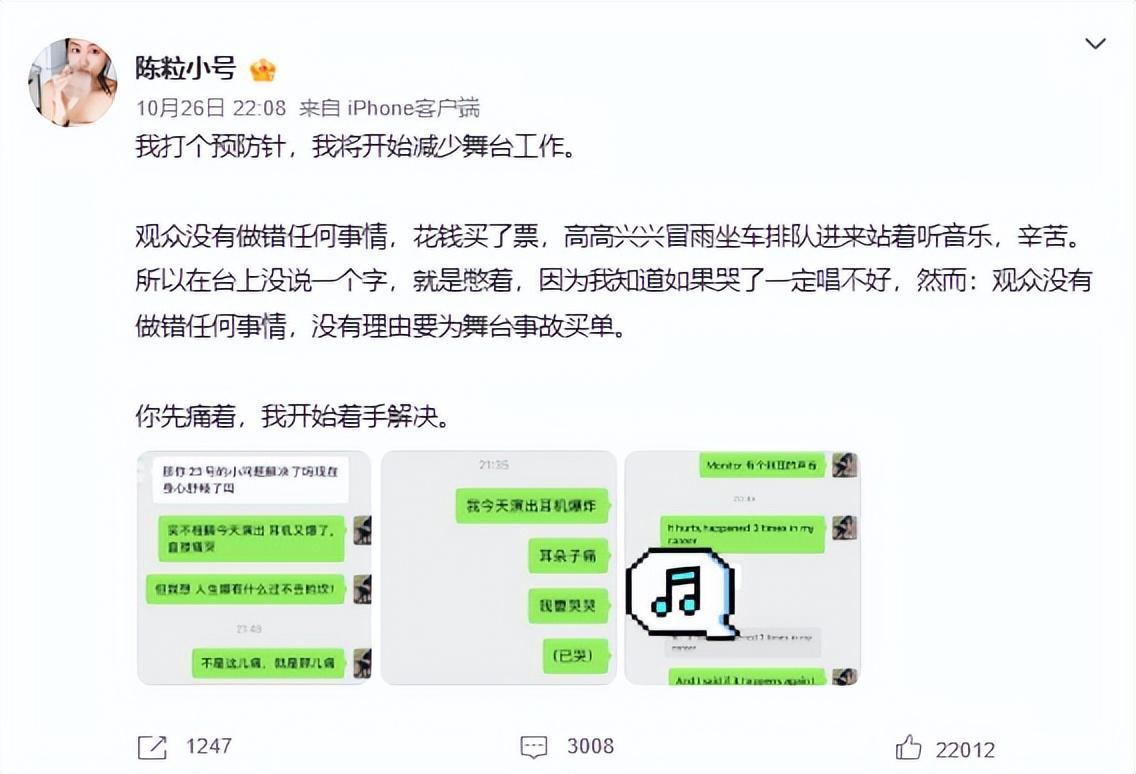 △据陈粒发布的聊天记录,她与朋友对话时称“今天演出耳机又爆了,直接痛哭”、“已经发生3次了”