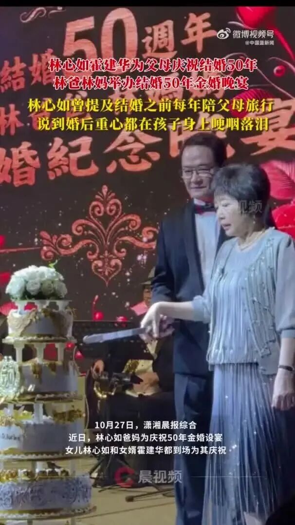 林心如霍建华为父母办金婚宴!切蛋糕画面太温馨,林父75岁状态年轻