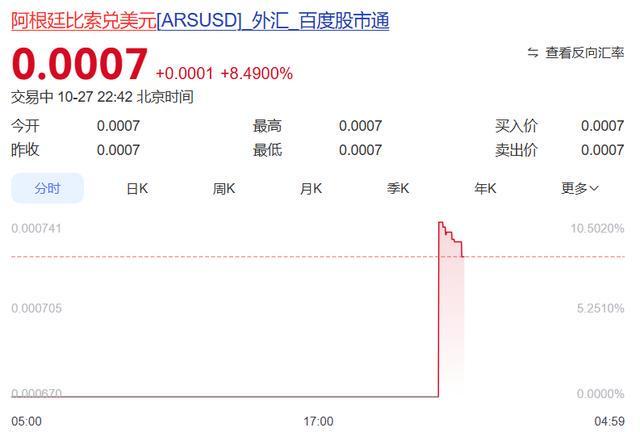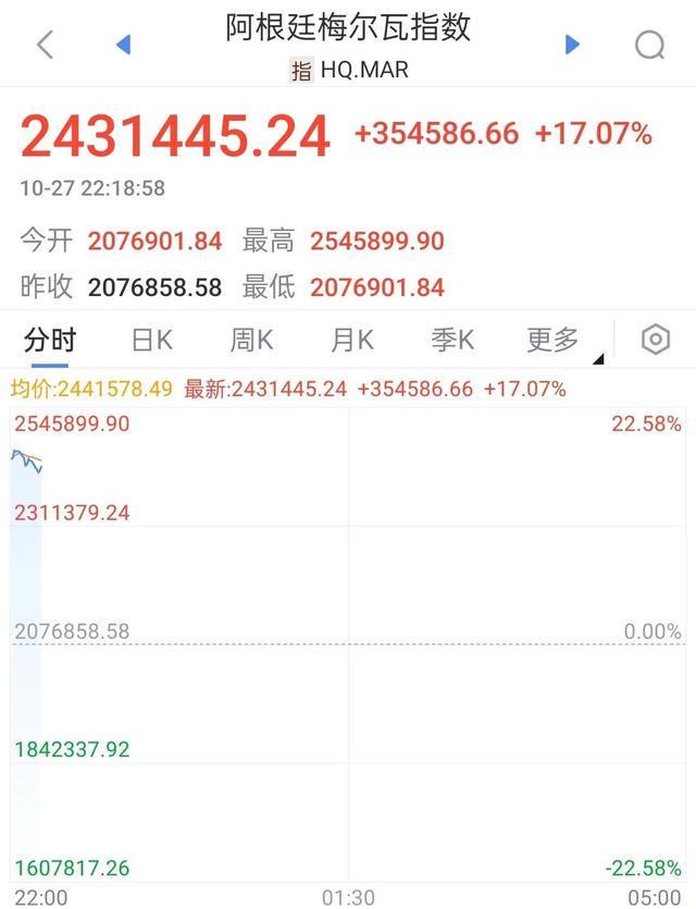 当地时间10月27日,阿根廷主要股指一度涨超20%,阿根廷比索兑美元一度涨超10%。阿根廷主要股指一度涨超20%阿根廷比... 当地时间10月27日,阿根廷主要股指一度涨超20%,阿根廷比索兑美元一度涨超10%。