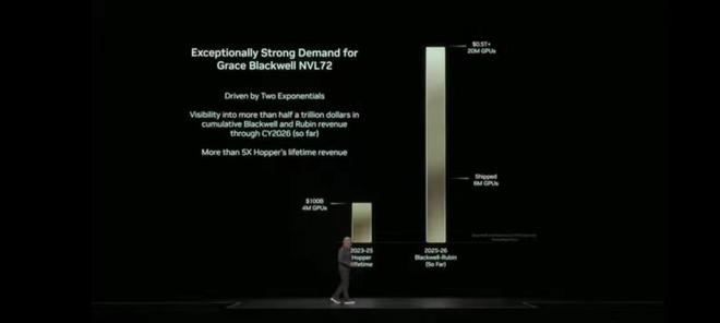 黄仁勋表示,英伟达Blackwell芯片正在美国亚利桑那州全面生产,英伟达还在为采用下一代架构Rubin的芯片生产做准备,Rubin进入生产的时间点可能是明年10月或更早的时候,“目前已经可以看到,今年及2026年(自然年),Blackwell和Rubin可带来的收入超过5000亿美元,这个收入将来自2000万颗GPU,目前已出货量600万颗。5000亿美元收入将是2023年~2025年Hopper架构芯片所带来收入的5倍。”