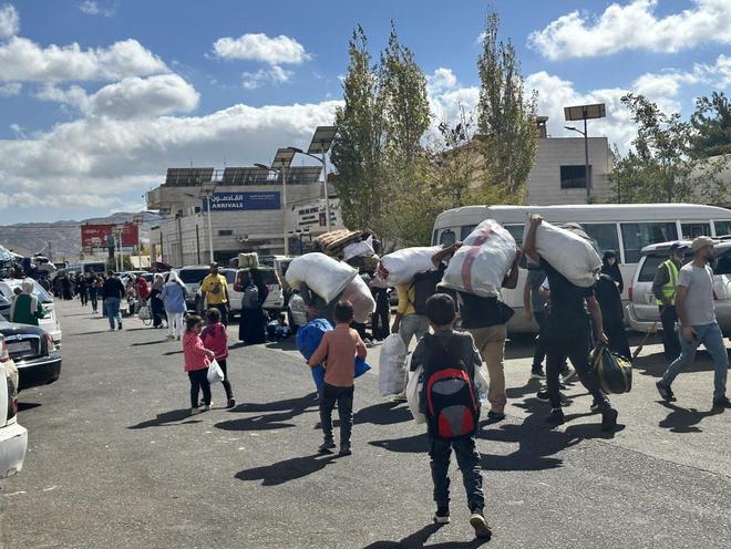 这是2024年10月1日在叙利亚与黎巴嫩边境的佳迪达·亚布斯口岸拍摄的来自黎巴嫩的流离失所者(手机照片) 图/新华社
