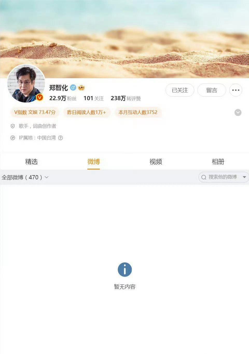 11月3日,郑智化清空微博。就在两天前,他的微博还只是“仅半年可见”,并保留了10月27日对“深圳机场连滚带爬”发声“不当”的致歉微博。