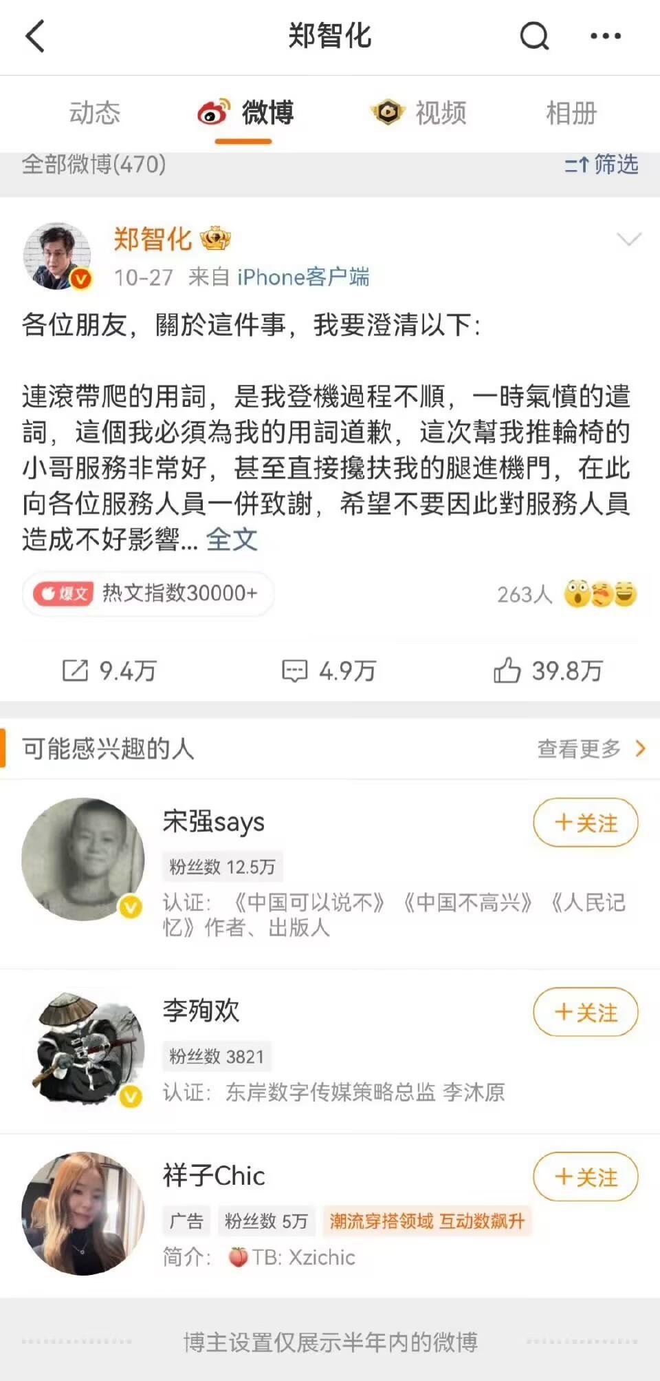 10月27日午间,郑智化发长文致歉:“连滚带爬的用词,是我登机过程不顺,一时气愤的遣词,这个我必须为我的用词道歉,这次帮我推轮椅的小哥服务非常好,甚至直接搀扶我的腿进机门,在此向各位服务人员一并致谢,希望不要因此对服务人员造成不好影响。因事件引发的对少数群体利益的关注,比我个人感受意义更大,交给社会各方讨论。”