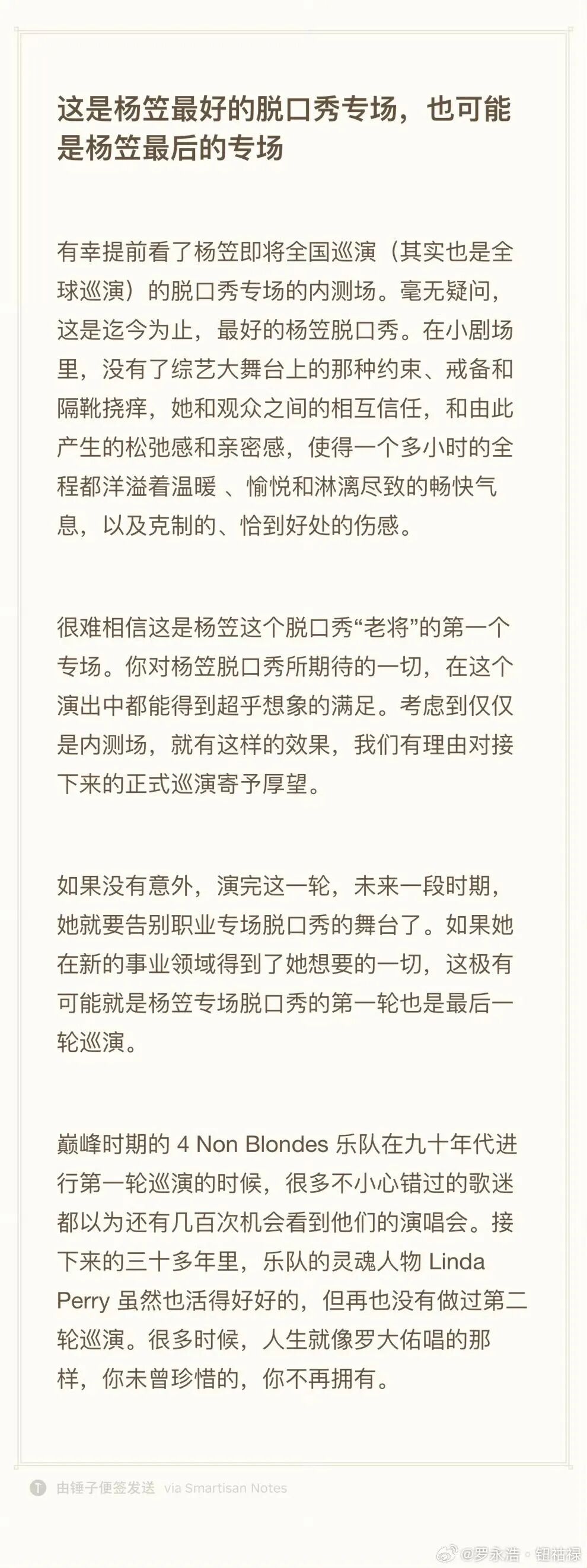 今年7月,罗永浩曾发长文点评杨笠的脱口秀专场,更透露:“如果没有意外,演完这一轮,未来一段时期,她就要告别职业专场脱口秀的舞台了。如果她在新的事业领域得到了她想要的一切,这极有可能就是杨笠专场脱口秀的第一轮也是最后一轮巡演。”