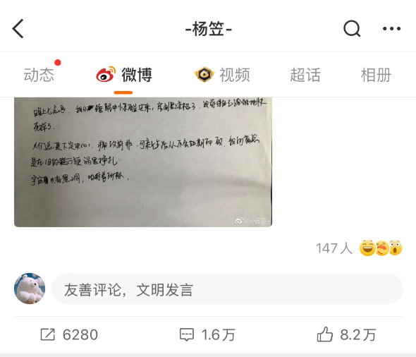 而杨笠的微博也有了变化,仅保留一条2020年11月发布的鼓励网友的置顶微博,并设置为“半年可见”。