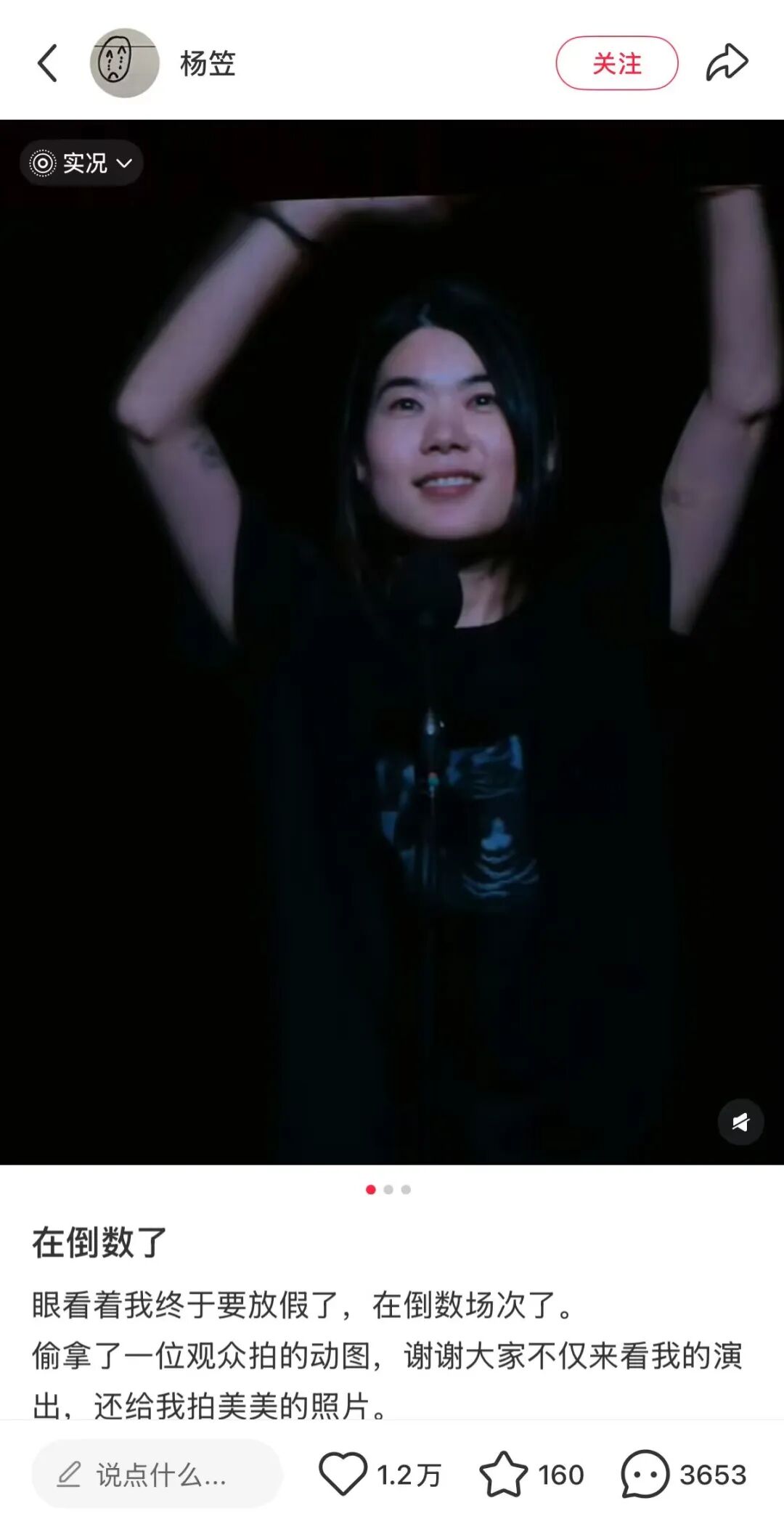 不过,杨笠的小红书账号依然保留着她的日常动态。10月24日,杨笠在小红书发布了一张演出结束时向观众挥手的图片,并配标题“在倒数了”,文中杨笠提到:“眼看着我终于要放假了,在倒数场次了。偷拿了一位观众拍的动图,谢谢大家不仅来看我的演出,还给我拍美美的照片。”