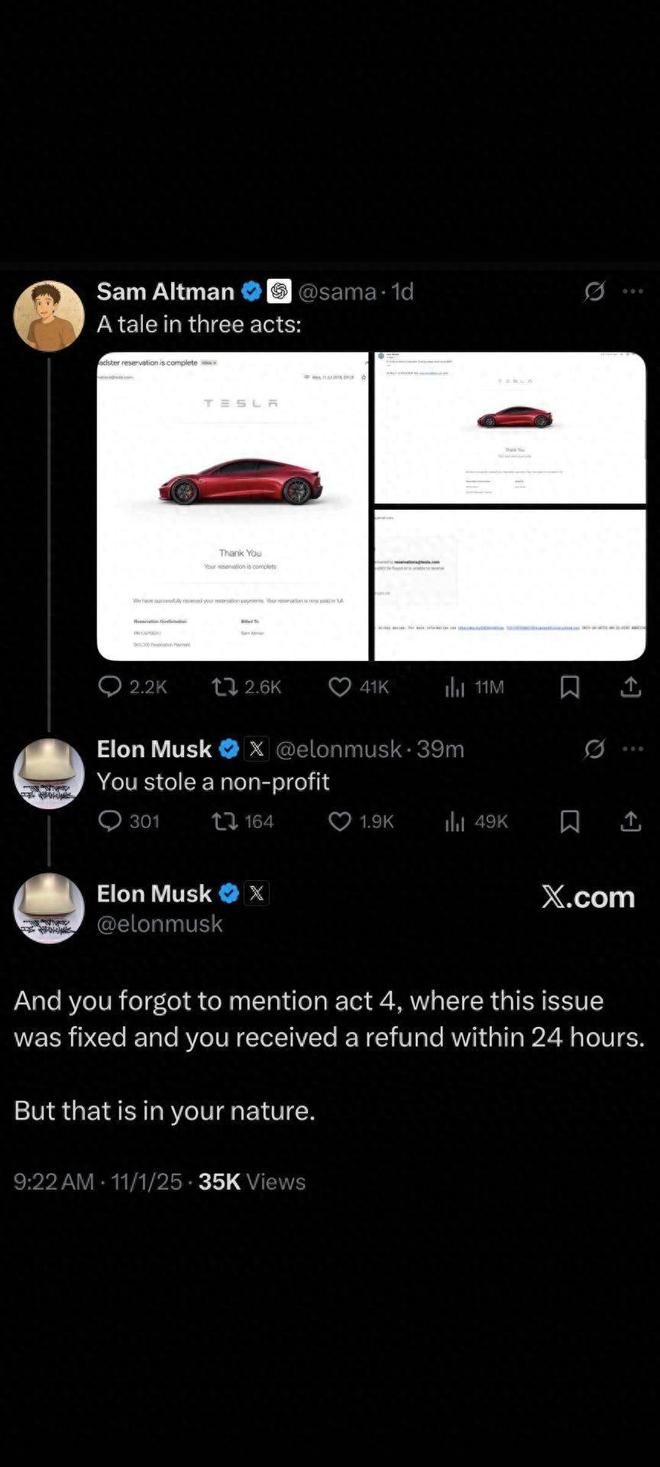 马斯克11月1日迅速回复,称奥特曼“忘记提第四幕:问题已在24小时内解决,你已收到退款,但这符合你误导人的本性。”