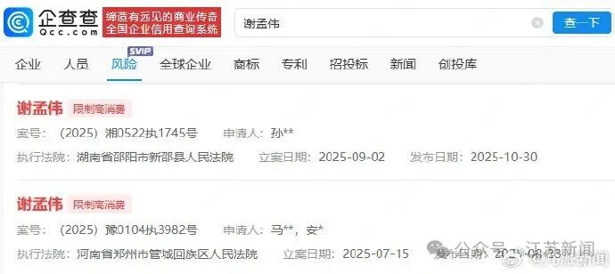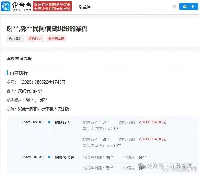 11月4日,记者从企查查APP获悉,因未按指定期间履行生效法律文书确定的给付义务,谢孟伟(嘎子哥)及郭珊珊(嘎子哥妻子)... 11月4日,记者从企查查APP获悉,因未按指定期间履行生效法律文书确定的给付义务,谢孟伟(嘎子哥)及郭珊珊(嘎子哥妻子)被限制高消费,涉及民间借贷纠纷案件,执行法院为新邵县人民法院。今年9月,二人已因此案被执行210万余元。