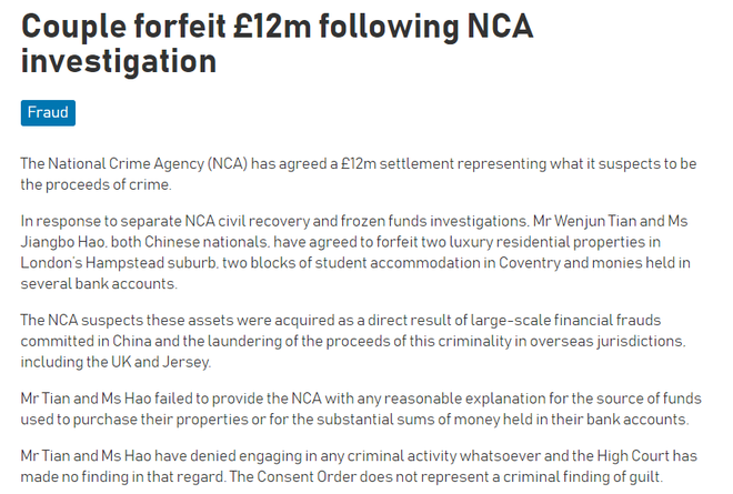 英国国家打击犯罪局(NCA)12月10日发布公告称,因始终无法提供其在巨额资产来源的合理解释,田文军及其妻子郝江波在英国的价值1200万英镑(约合人民币1.1亿元)的资产,包括伦敦汉普斯特德郊区的两处豪宅物业、位于考文垂的两栋学生公寓以及多个银行账户中的资金被正式没收。
