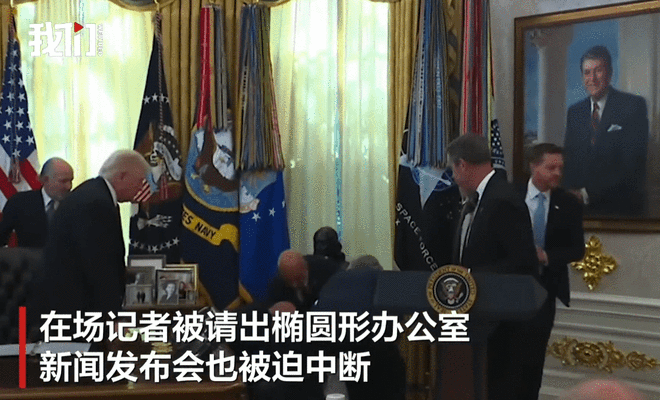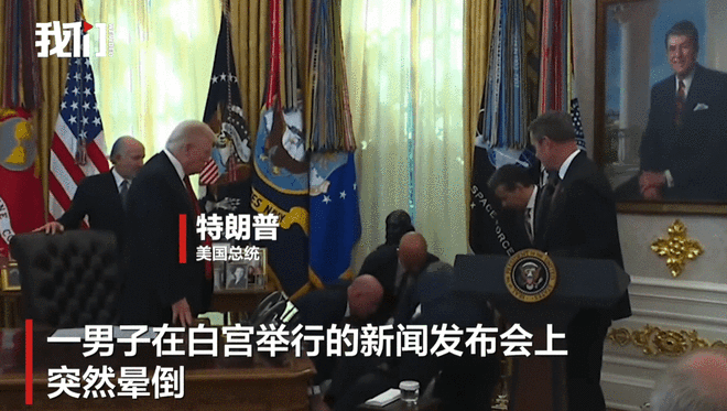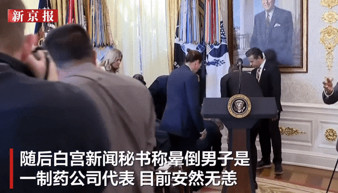 在场记者被请出椭圆形办公室,新闻发布会也被迫中断。随后白宫新闻秘书称晕倒男子是一制药公司代表,目前安然无恙。