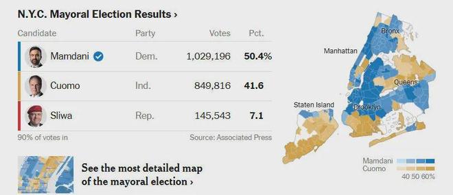 但上述攻击并未奏效。据分析,马姆达尼赢得超百万张选票,主要原因之一在于他组建了自己的联盟。据得票数据,他获得非裔、拉丁裔等少数族裔支持,在穆斯林、犹太教等传统宗教选区的得票率也遥遥领先。