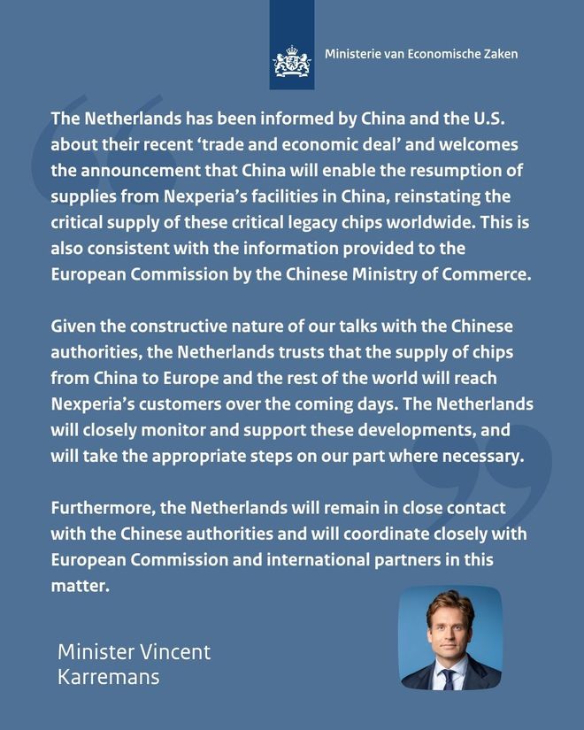 荷兰政府11月7日发布声明称,荷兰经济大臣卡雷曼斯表示,欢迎中方会为安世中国工厂恢复供货提供便利的表态,“鉴于我们同中方... 荷兰政府11月7日发布声明称,荷兰经济大臣卡雷曼斯表示,欢迎中方会为安世中国工厂恢复供货提供便利的表态,“鉴于我们同中方的会谈富有建设性,相信中国供应至欧洲和世界其它地区的芯片将在未来几天送达安世客户手中”。