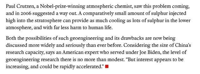 该媒体宣称,曾于1995年获得过诺贝尔化学奖的荷兰大气化学家保罗·克鲁岑提出,既然硫化物可以反射阳光,一定程度上降低地表温度,那么可以考虑人为向平流层注入适量的硫化物,从而在远离人类的高空中形成气溶胶,以抵挡太阳辐射,给地球降温。