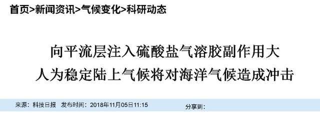 《科技日报》2018年的一篇文章也指出,有科学家分析发现,向平流层注入硫酸盐气溶胶的做法,极有可能影响海洋循环,并降低陆上降雨、改变区域性和季节性温度模式。