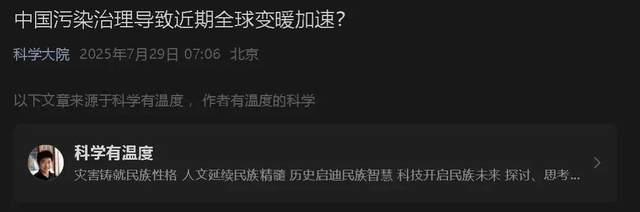 这篇文章除了标题荒唐,本身写得也相当拧巴,一方面它要表达大气污染物中的硫化物气溶胶能反射太阳辐射,中国清除掉它们会导致地表升温、加剧全球变暖,但另一方面又不得不承认硫化物气溶胶对人体有明显害处,中国的治理在维护生命健康上有积极意义。