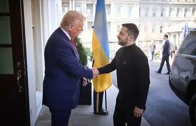当地时间2月28日,美国总统特朗普与乌克兰总统泽连斯基在白宫椭圆形办公室举行会谈前,特朗普到门外迎接泽连斯基,两人握手时他称泽连斯基“盛装打扮”,疑含蓄地批评对方到访没有穿西装。