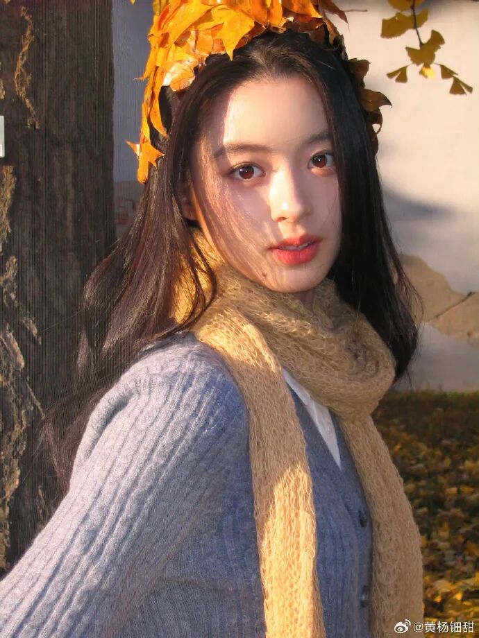 照片中,18岁的黄杨钿甜穿毛衣头顶落叶,化着淡妆,状态大好。