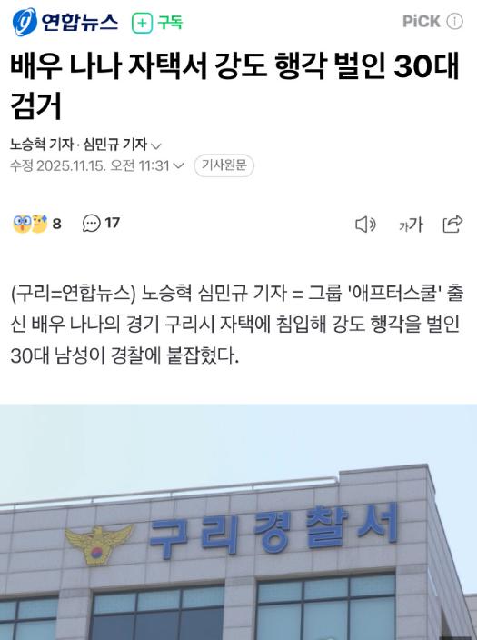 据韩媒,11月15日,韩国一名30多岁男子闯入组合 After School 出身的演员@NANA_林珍娜位于韩国京畿道... 据韩媒,11月15日,韩国一名30多岁男子闯入组合 After School 出身的演员@NANA_林珍娜位于韩国京畿道九里市住宅并实施抢劫。