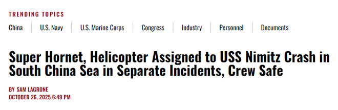 美国海军学会网站26日称,根据太平洋舰队的声明,当地时间10月26日下午2时45分左右,一架隶属于第73直升机海上打击中队的MH-60R“海鹰”直升机从“尼米兹”号航母起飞执行“例行行动”时,在南海海域坠毁。该机的三名飞行员成功获救。当天下午3时15分,同样从该航母起飞的一架F/A-18F“超级大黄蜂”战斗机在执行“例行行动”时也在南海海域坠毁。两名飞行员成功弹射,并被安全救起。美国海军表示,目前这两起事件的原因正在调查中。