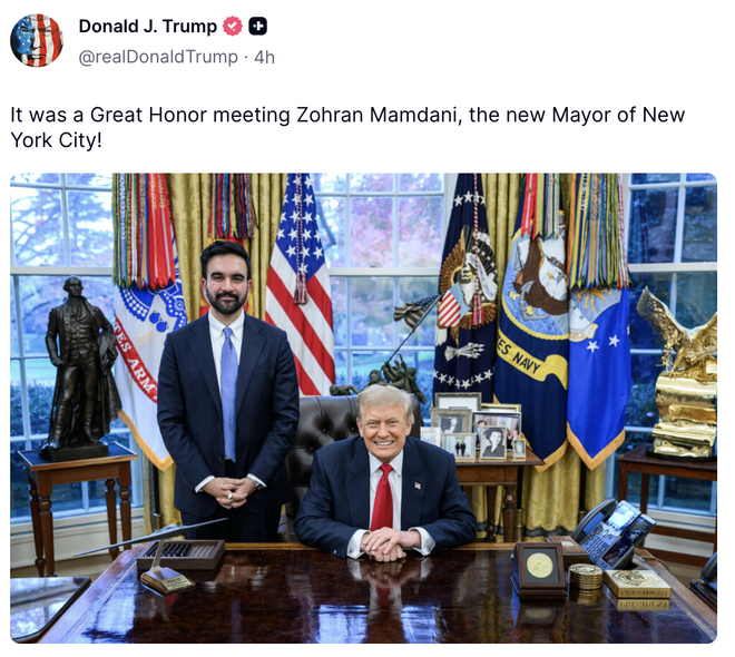 特朗普与纽约当选市长祖赫兰·马姆达尼合影 图源:特朗普社交平台