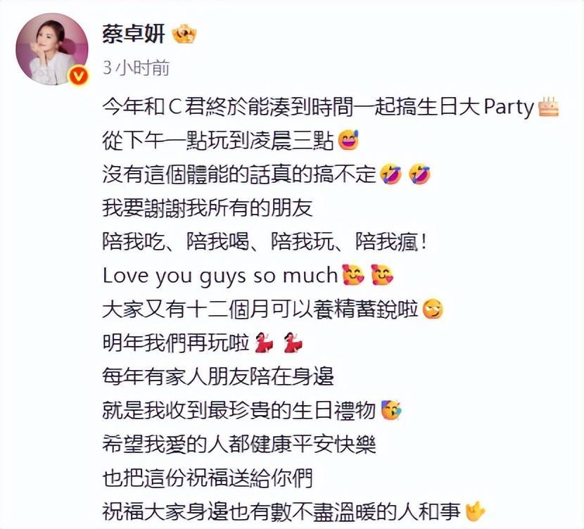 蔡卓妍还在长文中坦言今年是“历年体重最高峰”,但已不再焦虑年龄与体重,更重视健康与当下幸福。