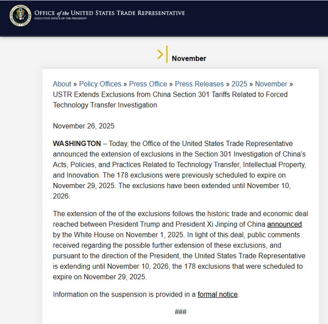 图为美国贸易代表办公室网站截图