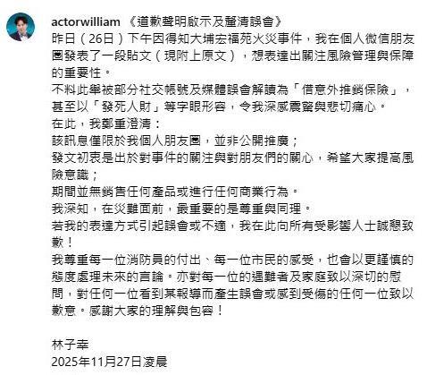11月27日凌晨,林子幸也在社交媒体发出道歉声明及误会澄清。他提到,他在个人微信朋友圈发表贴文,是想表达关注风险管理与保障的重要性。“仅限于我个人朋友圈,并非公开推广,发文初衷是出于对事件的关注与对朋友们的关心,希望大家提高风险意识,期间并无销售任何产品或进行任何商业行为。”