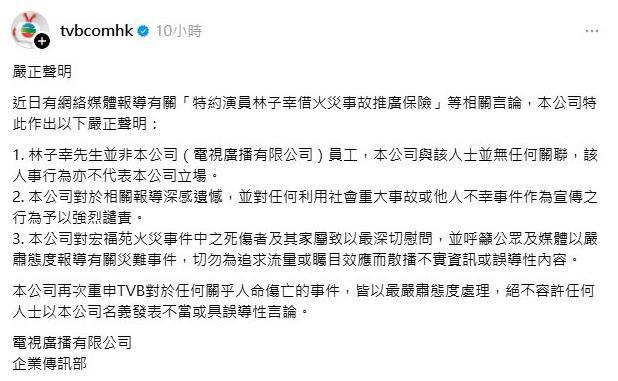 TVB企业传讯部深夜发出严正声明,提到林子幸并非该公司(电视广播有限公司,也即TVB)员工,该公司与该人士并无任何关联,该人事行为亦不代表该公司立场。
