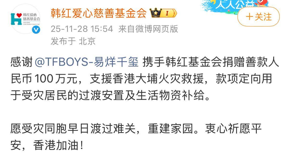 11月28日15时54分,韩红爱心慈善基金会发文,感谢易烊千玺捐赠善款100万元,支援香港大埔火灾救援。