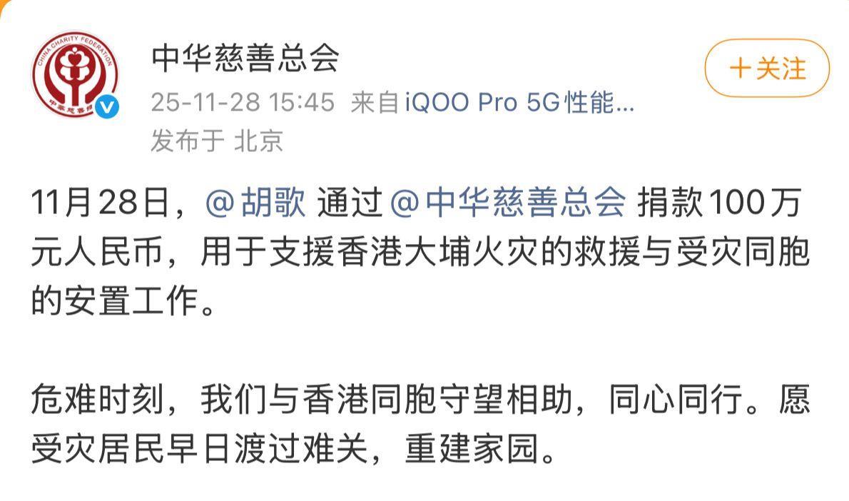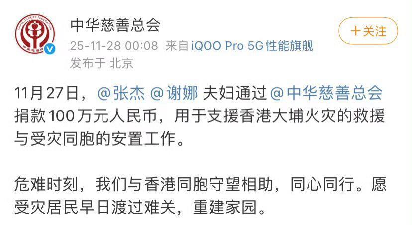 11月28日下午,中华社会救助基金会官方账号发文,称收到著名演员杨紫100万元捐款,定向用于援助香港大埔火灾受灾同胞的安置保障和灾后家园重建工作。当日中午,该账号还发布了张艺兴捐款100万元的消息。