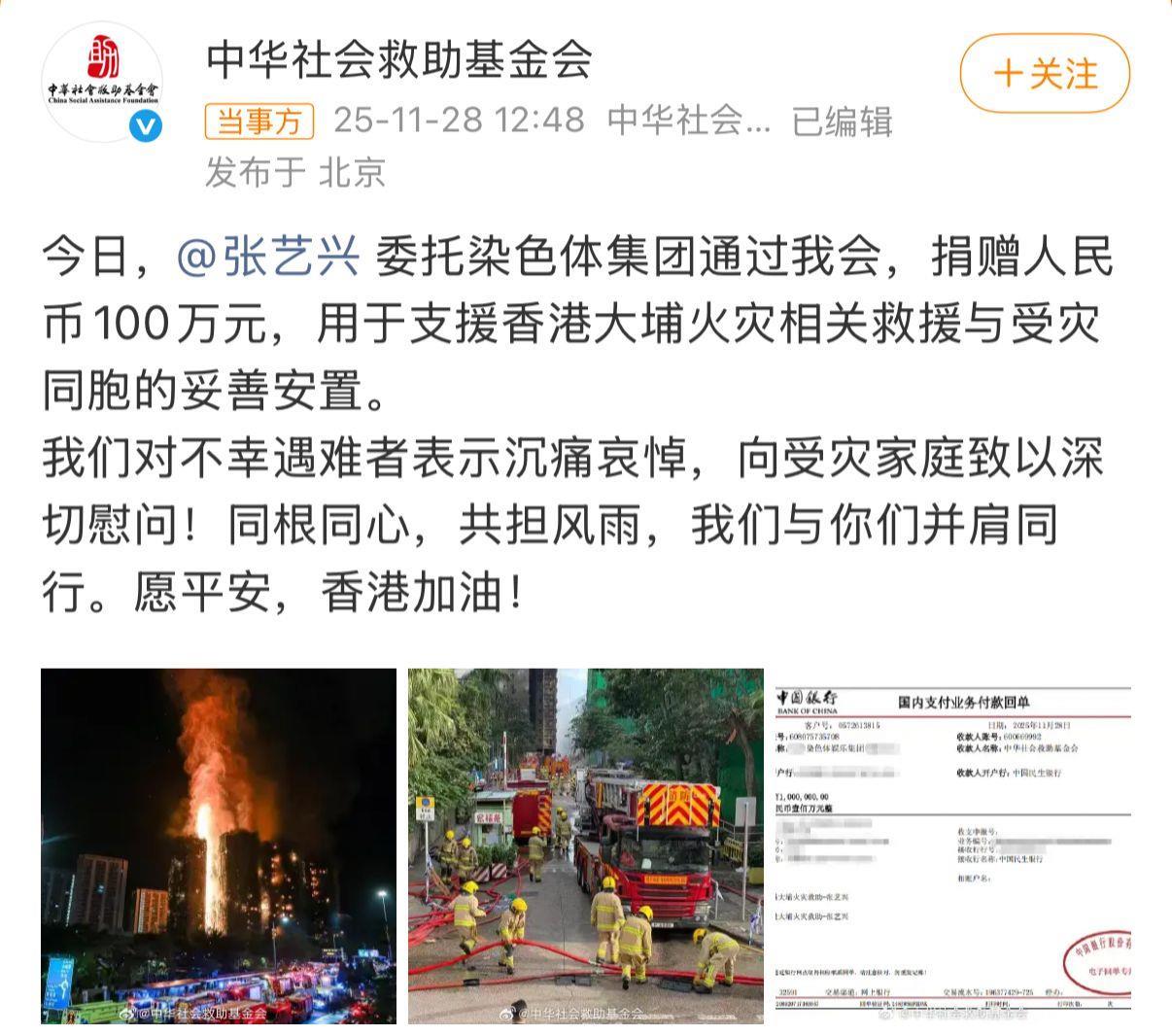 中华社会救助基金会官方账号分享的图片显示,张艺兴系委托染色体娱乐集团,通过中华社会救助基金会捐赠人民币100万元,用于支援香港大埔火灾相关救援与受灾同胞的妥善安置,付款回单里备注了“香港大埔火灾救助-张艺兴”。