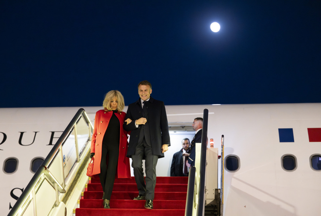 12月3日,马克龙(右)和妻子布丽吉特抵达北京 图源:新华社