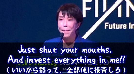 12月1日,高市在东京举行的国际投资会议上引用动漫《进击的巨人》主角艾伦·耶格尔的台词称“都给我闭嘴吧,把钱都投到我这儿来!”,此举被群嘲是没有分寸。