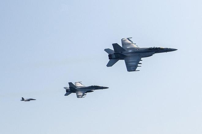 ▲美国海军的F/A-18F“超级大黄蜂”战斗机在红海上空飞行 图据视觉中国