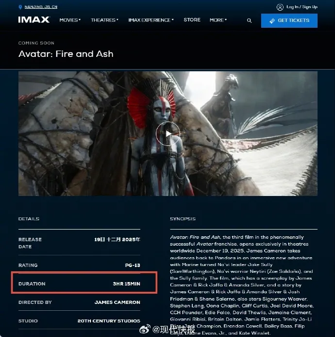 据此前报道,11月12日,IMAX官网最新公开的信息显示,电影《阿凡达:火与烬》(阿凡达 3)片长为3小时15分钟,也就是195分钟,创《阿凡达》系列最长片长纪录。