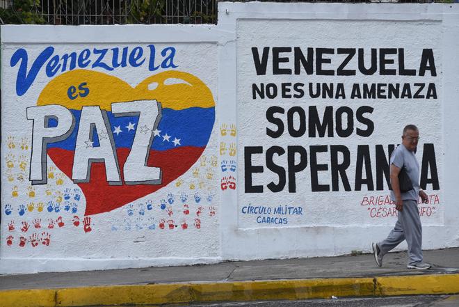 9月22日,在委内瑞拉首都加拉加斯,行人从街头的宣传标语前走过。标语上写着“委内瑞拉是和平国度”“委内瑞拉不是威胁,而是希望” 新华社发(马科斯·萨尔加多摄)