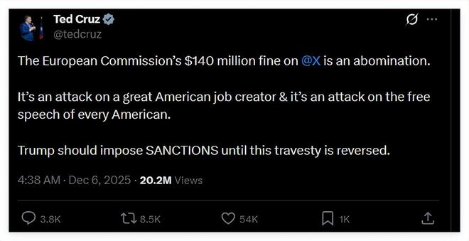 其中,鲁比奥宣称欧盟的处罚行为是对美国所有科技平台和美国人民发动的“攻击”的帖文,以及美国国会共和党籍参议员克鲁兹称欧盟的处罚是对美国的“就业”和“每一个美国人的言论自由”发动“袭击”的帖文,截至8日傍晚已经分别获得了2360万和2000万的阅读量。