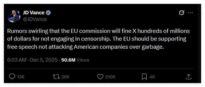 这场美欧官员“口水仗”的第一把火,是由美国副总统万斯点燃的。在上周欧盟决定以违反社交网站监管规则为由对X平台处以1.4亿美元罚款的消息传出后,万斯于12月5日发布一则帖文,斥责欧盟试图强迫X限制言论自由,还骂处罚X平台的规则是“垃圾”。
