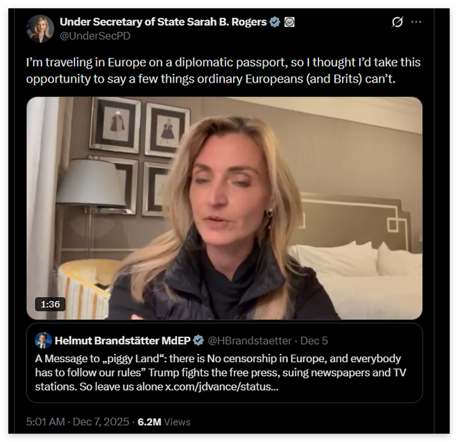 比如,在过去的这个周日,正在欧洲出差的美国国务院负责公共外交的副国务卿罗杰斯,干脆在自己的住所录制了一段近2分钟的视频,其中列举了一连串据她所说的欧盟(以及英国)“打压言论自由” 的案例。