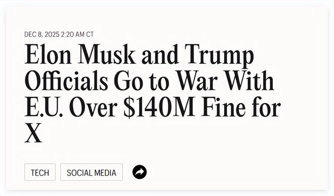 “政客新闻网”欧洲版评论称,对X平台的处罚决定,让欧盟与特朗普政府之间本已紧张的关系雪上加霜。
