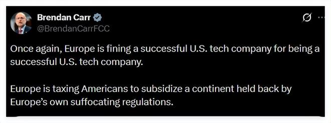 随后,负责监管美国互联网接入、电视和广播等通信网络的美国联邦通信委员会(FCC)的主席布伦丹·卡尔(Brendan Carr)也在12月5日发帖,将欧盟对X的处罚描述成是“腐朽的欧盟”对美国科技企业的羡慕嫉妒恨。