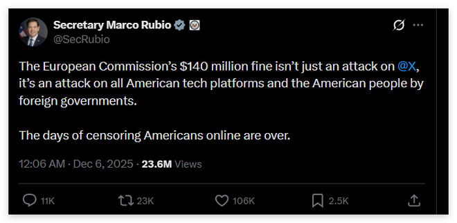 鲁比奥5日在X平台发文称,欧盟委员会1.4亿美元的罚款不仅针对X平台,更是外国政府对美国科技企业及美国民众的攻击。