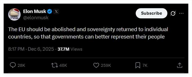 作为X平台的拥有者,马斯克则呼吁废除欧盟。