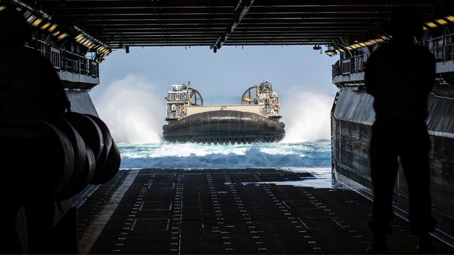 一艘气垫登陆艇准备进入两栖攻击舰