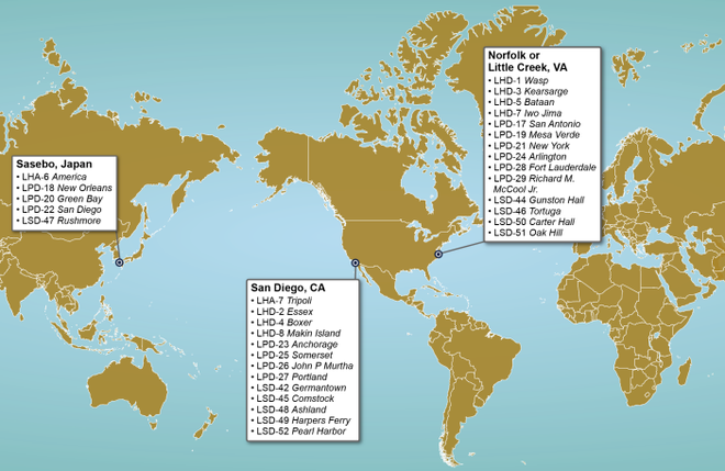 美国海军两栖舰艇主要部署在全球三处基地