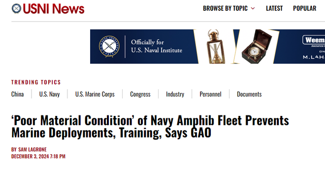 时任海军陆战队助理司令埃里克·史密斯上将曾于2023年7月承认,美国海军两栖远征打击群“过去5次部署中有4次都未能按时进行”。