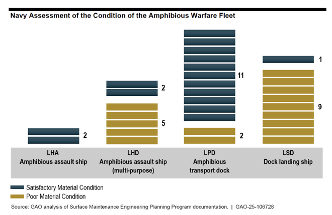 反正美国政府问责办公室的报告承认,美国海军即便维持至少31艘两栖舰艇的规模,也并不意味着这些舰艇就适合部署或训练。“在某些情况下,两栖舰队内的舰艇多年来一直无法支持海军陆战队的行动和训练。”